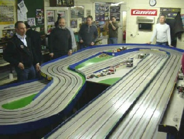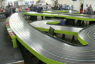 Almost all clubs build their own tracks. These are usually built with the slot cut in either MDF board or chipboard. Most tracks are built on a wooden frame raising the track surface about 80 cm. from the floor. These tracks work on a similar principle to the plastic track supplied with home sets. Most British club tracks have 4 lanes, but a few clubs have 5, 6 or even 8 lanes. The lap lengths of the tracks are typically between 20 and 50 metres. Every clubs track is different, some have short straights and tight corners, others have long straights and fast sweeping corners, many have all these features. Click here for a guide to track building and maintenance.