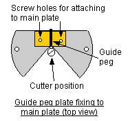 On top of the aluminum plate (shown as gray) I screwed a small piece of brass plate (shown in yellow), and soldered a "L shaped piece of brass wire to this to act as the guide peg. (I used 1.2mm thick brass and M3 screws, but the sizes are not important). The diagram at the top of the page shows where the L shaped guide peg fits. A bit of trial and error adjustment was needed to get the position of the peg right. Having got it right, it's important to do the screws up tight and use some loctite to keep them tight.