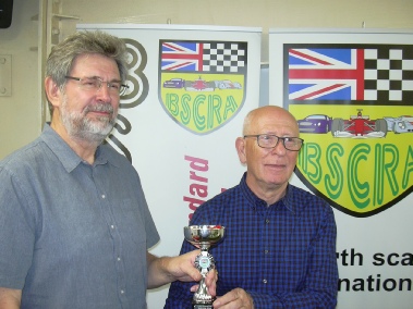 The winning car : James Cleave with the winning trophy presented by former BSCRA chairman George Kimber