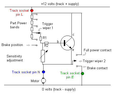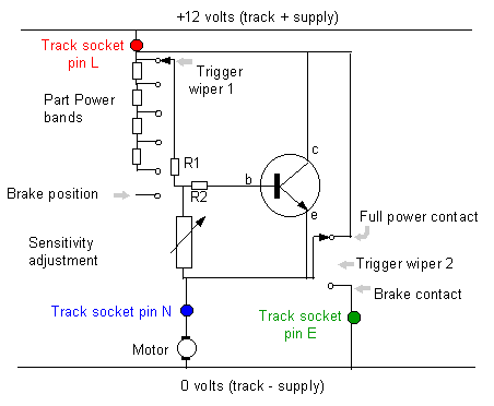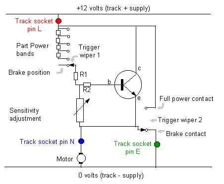 British" Darligton PNP circuit? In many ways it is quite similar except This NPN circuit uses a single transistor not a "Darlington pair", with a single transistor the voltage drop is never less than 0.6 volts, with a "Darlington pair" there are two transistors in series so the voltage drop is never less than about 1.2 volts. The NPN circuit needs two isolated wipers connected to the trigger where as a circuit using PNP transistors needs just the single wiper. (The base of an NPN transistor needs to be connected to pin N to turn off when the controller is on brake. The base of a PNP transistor needs to be connected to pin L to turn off when the controller is on brake.) |