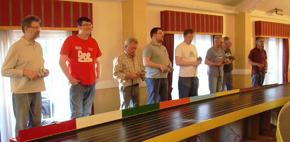 Overall final. Top qualifier James Cleave took the lead in the first segment, even though he wasn’t on a quick lane. (A lot of drivers prefer to start on the slower lanes and finish on the fast ones.) Gavin Wills was in a close second at quarter distance, but once James was on the quicker lanes he pulled away. Ross Grogan also chose to start on two of the slower lanes, once those were behind him, he was the closest challenger to James although he was 7 laps in arrears by the end. Graham Woodward challenged for third later in the race, but had to settle for fourth 3 laps behind Gavin Ian Barker made a slow start on the un fancied red lane, but had a quick finish to take 5th just a lap behind Woody. |