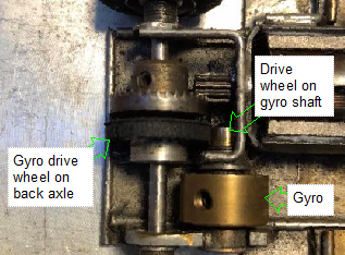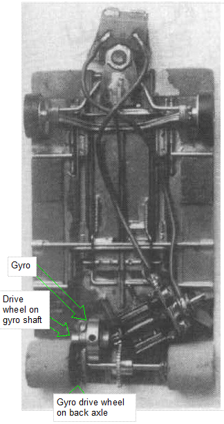 The close up shows the back axle gyro drive wheel has a rubber outer face. This is intended to expand slightly as the revs increase giving increased pressure against the drive wheel on the gyro shaft. The idea is to disengage the drive as the car brakes for a corner thus leaving the gyro spinning faster in a corner. That would increase the gyro effect.