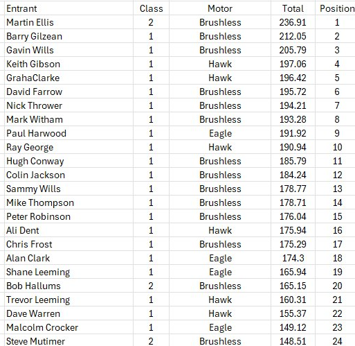 Martin Ellis won overall and was fastest by quite a large margin with his 4500 KV powered Genesis.