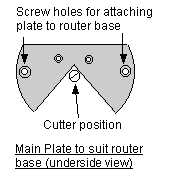 As can be seen from the photo (above left) the base plate of the router has two fixing holes. Make a plate to fit the base of the router as shown on the right. A pair of countersunk screws are used to fix it to the router base plate using the arrowed holes. these screws need to be the right size to fit the holes in router bed. Take care to mark which way round the plate fits - they certainly were not symmetrical on my (rather cheap) router. I used 3mm thick aluminum for the plate, but the thickness and type of material are not important.