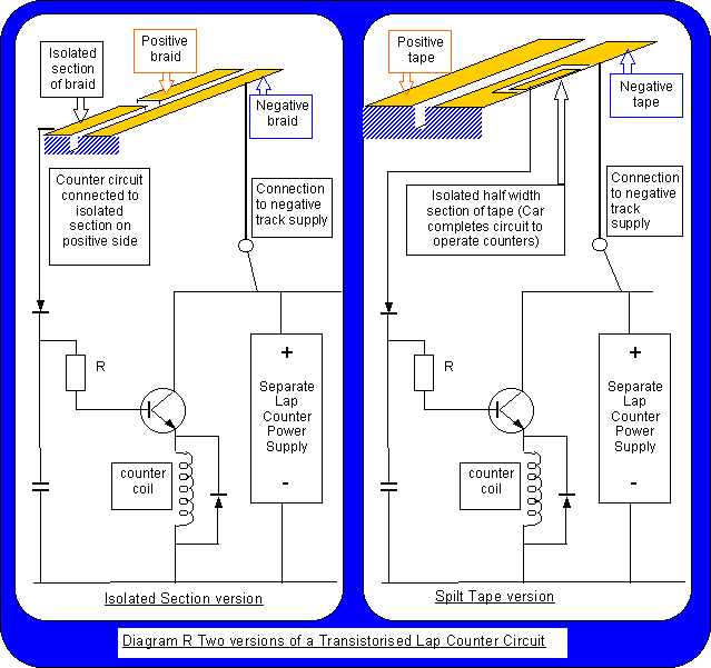 "Split tape" counter strips get round the need for a dead section, by providing a half width tape carrying the power, and an isolated half width (see the right hand half of diagram R). When the cars braid bridges the two half widths of tape it completes the circuit and operates the counters. This tends to give a worse pulse than a dead section, (A dead section removes the power from the motor so the guide is pressed down into the slot, and a split tape depends on a wider contact). This sort of counter strip is not used with braided tracks - try cutting a piece of braid to half width and you end up with a pile of separate short bits of wire!