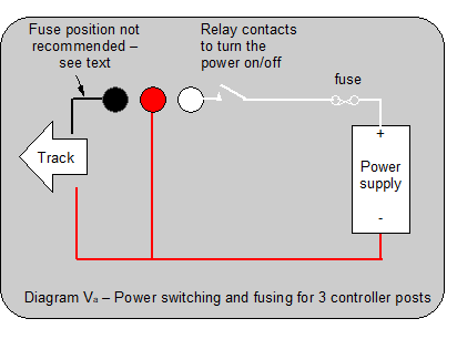 show connections for sockets used in BSCRA racing and the 3 controller post set up used on a lot of other countries. The "power on/off" shown in Diagram V and Va would usually be a relay contact. This should be mounted between the power supply and the socket as shown. This removes power from the controller when track power is turned off which can be very useful if a faulty controller is plugged in. (Putting the power on/off on the "N" lead (the black wire in Diagram V) would still turn off the track but would leave the power permanently connected to the controller)The power relay should have contacts rated to carry the maximum current a car will take. 20 amps per lane is adequate for BSCRA cars. A separate contact for each lane is ideal. A separate relay for each lane is a good idea - it allows individual lanes to be switched off which can be useful in holding cars on the start line. These relays are available for a few pounds each, and are commonly used in full size cars. This will work well for home set type cars, but if higher power cars are never going to be used a much lower rating relay is adequate.