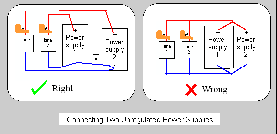 Separate wiring to each lane is important. If the wiring is common (see "wrong!" half of Diagram W), when one lane is drawing power the voltage to all the lanes will drop by say 1 volt. So the