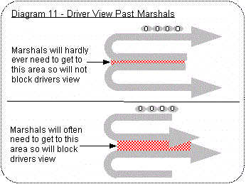 If the marshal is seated then drivers can see over the top of them, but the view of the space immediately behind the marshal will be obstructed. If you are relying on the drivers seeing over the top of the marshal, its advisable to draw it out to scale to make sure where the "blind spots" are (see diagram 14 - I haven’t put sizes in this diagram because the will depend on how high the track is from the ground, the height of the marshals chair, the height of the drivers rostrum etc.)