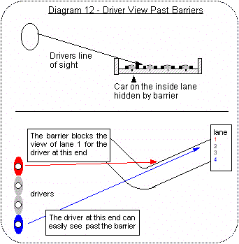 Diagram 12 shows how the barriers can block the drivers view of some parts of the track. The problems are usually worst on corners furthest away from the drivers, there is a better angle to see over the top of nearby barriers. Formula 1 cars are usually the lowest and therefore most likely type of car to be hidden . The options to provide the driver with a better view are:-