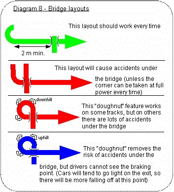 (b) Don’t put bridges over straights immediately after corners. Diagram 7 illustrates the parts of a straight where cars tend to fall off - on medium speed corners 2 metres (6-7ft.) should be sufficient, on really fast corners try for rather more. Ideally the more space you can allow between the exit to a corner and going under a bridge the better - but see (c).
